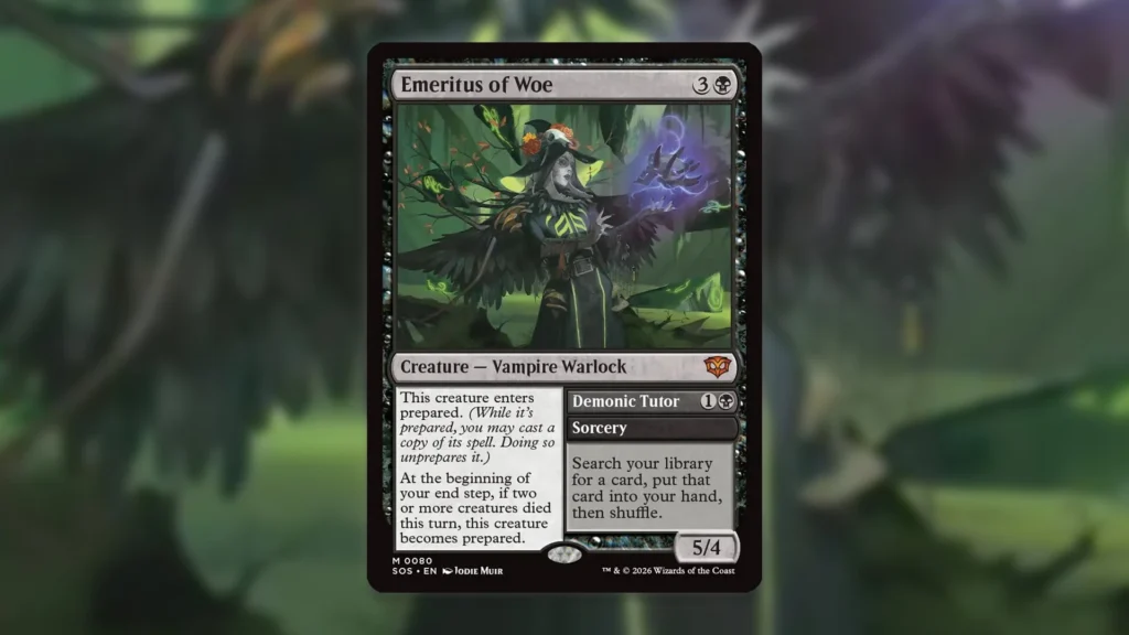Emeritus of Woe es el equivalente negro: una criatura de cuatro manás que, si la preparas correctamente, te permite castear Demonic Tutor al entrar, y puede volver a “reprepararse” para repetir el tutor varias veces durante la partida.