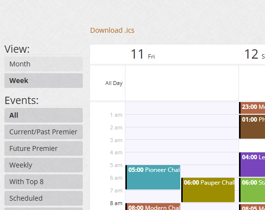 El calendario oficial de MTGO ahora es descargable en formato iCalendar (.ics). Puedes integrarlo en tu Google Calendar, Outlook o cualquier app compatible.
