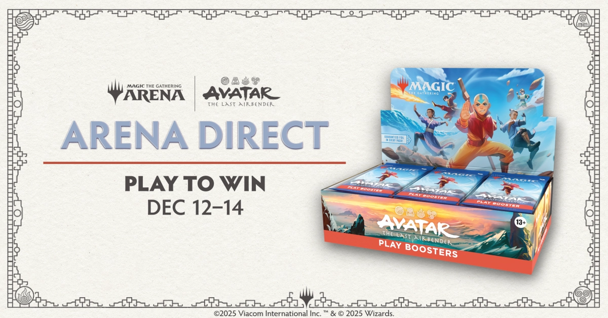 Del 12 al 14 de diciembre se realizará un nuevo Arena Direct con formato Sellado Best-of-One usando sobres de Magic: The Gathering | Avatar: The Last Airbender. Además de gemas y sobres digitales, los jugadores que consigan entre seis y siete victorias podrán ganar cajas físicas de Play Boosters de Avatar: The Last Airbender, enviadas directamente a su domicilio mientras haya existencias.
