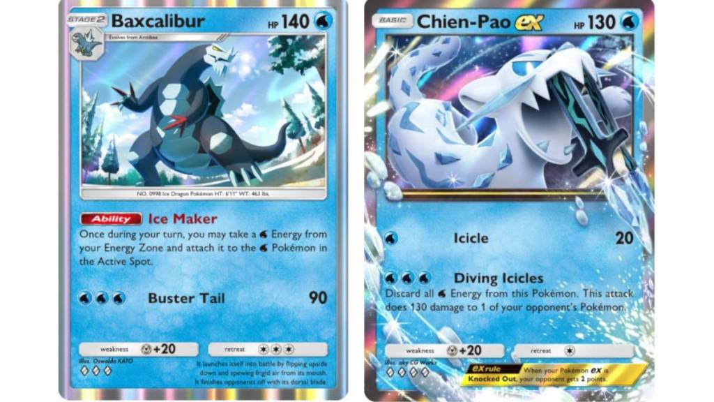 El otro gran añadido es Chien-Pao ex, legendario de agua que puede descartar toda su energía para hacer 130 puntos de daño a cualquier objetivo, incluyendo Pokémon en Banca. Frente al “plinking” de 20 en 20 que ofrecía el ninja frog, esta línea transforma al mazo en una máquina de KOs limpios alrededor de la mesa. Suicune se encarga de asegurar flujo de cartas hasta llegar al escenario ideal: dos Baxcalibur en juego para recargar a Chien-Pao ex turno tras turno y repetir Diving Icicles sin perder ritmo.​