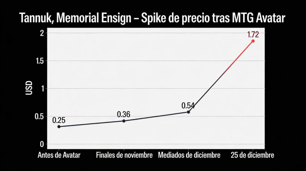 Tras el lanzamiento de Avatar, Tannuk empezó a venderse fuerte: más de 750 copias near mint no foil en una semana apenas lo empujaron hasta unos 0.36 dólares, y otra ola de ventas lo subió a unos 0.54 dólares a mitad de diciembre.