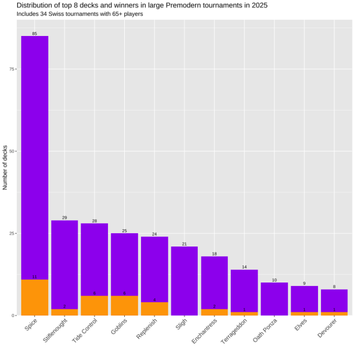 Buenas noticias: Premodern mantiene diversidad. El “spice” representa ~40% de Top 8s, y eventos locales siguen siendo el alma del formato.