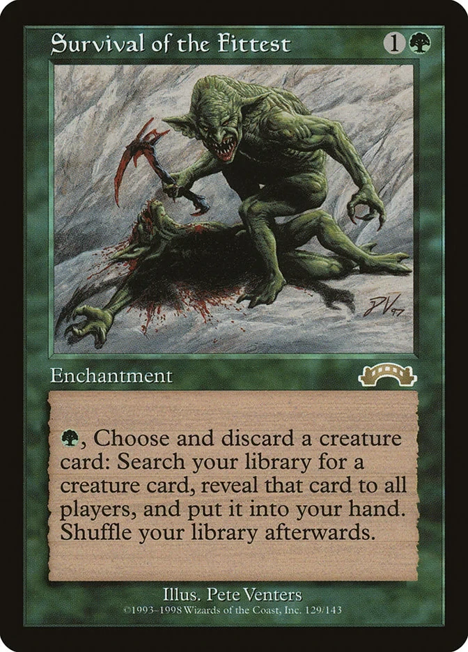 - Survival of the Fittest (baneada en Historic): Tutor repetible de criaturas por G, potente en Brawl y Timeless.