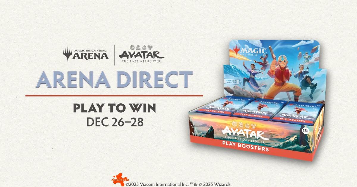 Del 26 al 28 de diciembre se celebra el último Arena Direct de 2025, en formato Sellado Best-of-One usando Magic: The Gathering | Avatar: The Last Airbender. En este evento especial, las victorias se traducen en sobres y gemas dentro de MTG Arena, pero quienes consigan 6 o 7 triunfos se llevan como premio cajas físicas de Play Boosters de Magic: The Gathering | Avatar: The Last Airbender enviadas a domicilio. La página de Arena Direct recoge condiciones completas, elegibilidad y detalles logísticos, incluyendo plazos de registro y términos legales.